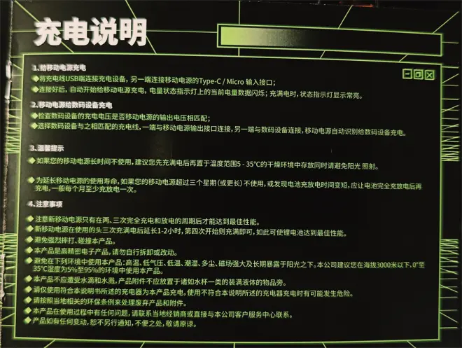 其中给我留下深刻印象的两点:一是首次使用要完全将电用尽后,再充满至满电,此操作反复三次,可以提升电源的耐用寿命;二是如果长时间不使用,需要完全放电后再充满,至少每隔三周至一个月要如此操作一次。相当于给这款电源做定时保养了。