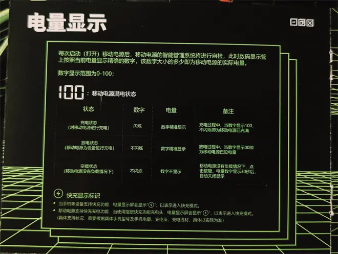 移速户外移动电源左上部自带的电量数显屏,帮助使用者能够一目了然,知晓剩余电量,既能起到实时的电量提示,又能保障在及时补充电源提醒,人性化的大数字显屏,最大程度避免不知道电源中余电几何而可能造成的缺电尴尬。