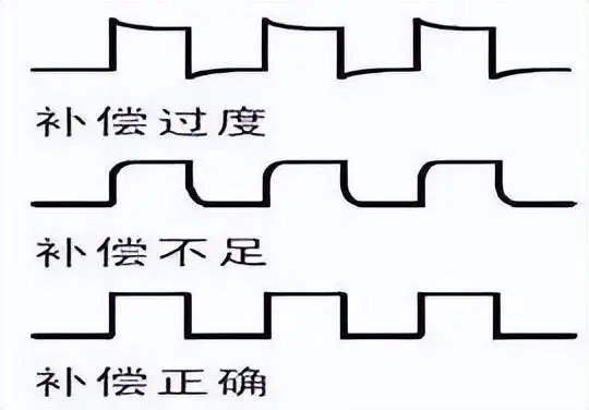 3.如果波形不正确,请调整探头。如下图三所示,直至波形为上面的补偿正确波形。