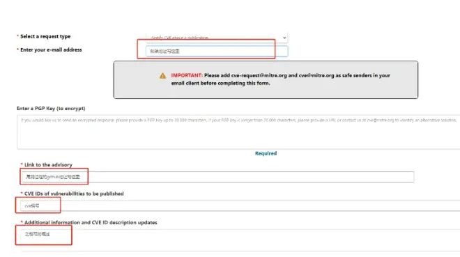 接下来申请公开cve编号。 https://cveform.mitre.org/