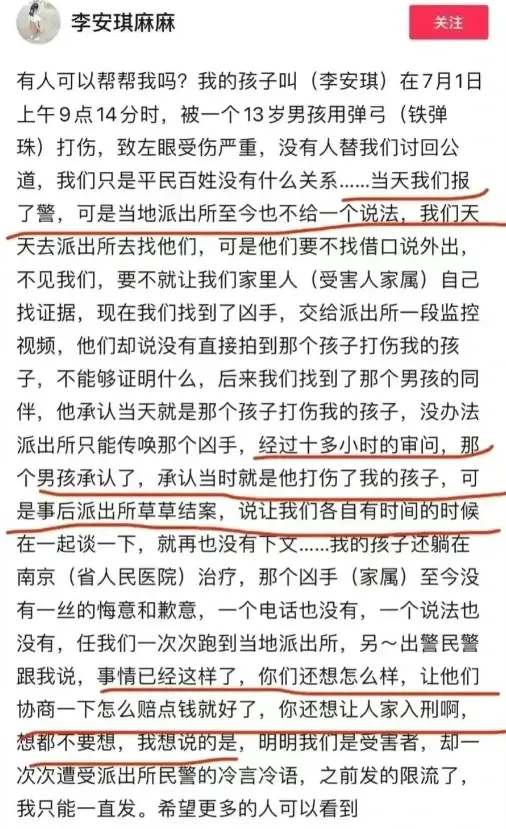 这是什么样的家长?孩子被其他孩子行凶,却无法追究责任,该怎么办?最近,在江苏宿迁发生了这样的一起事件。一名女子称他的8岁女儿被两名男孩用弹弓打中眼睛,导致女儿的眼球破裂并失明。