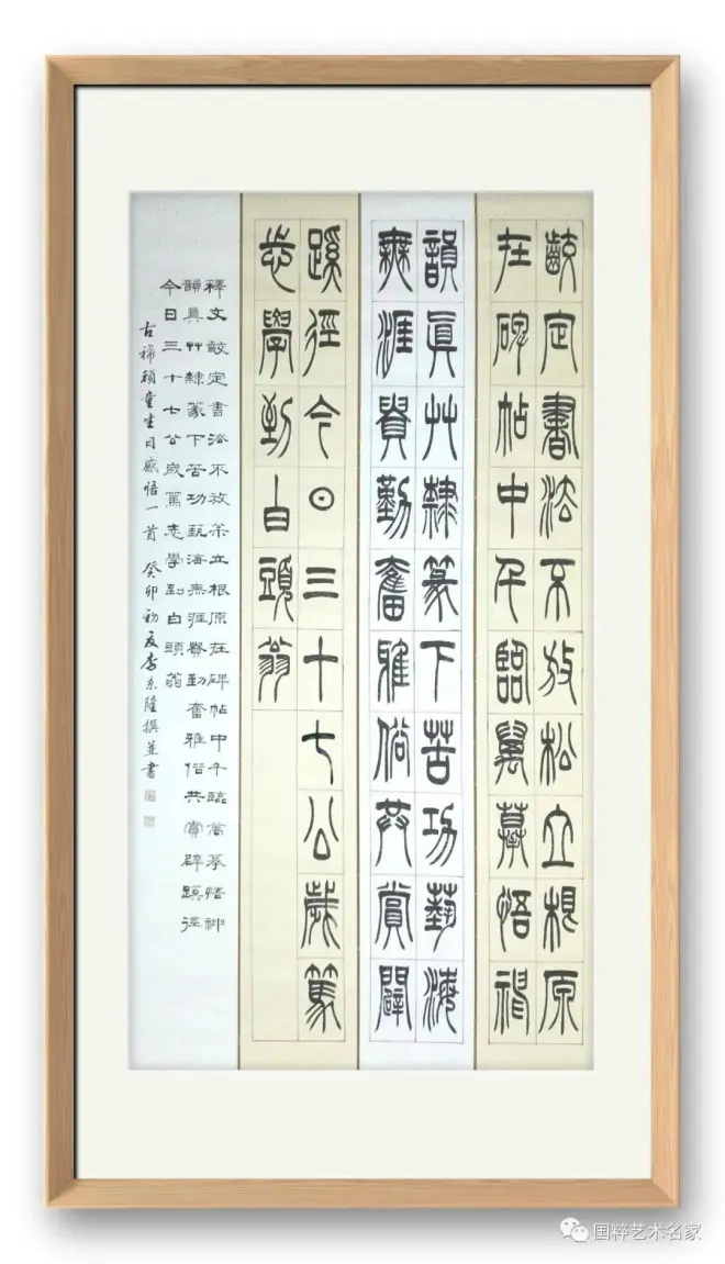 真正的书家,在真、草、隶、篆的来回锤炼中,最终要找到属于自己的一脉风格才行。李京隆先生以他对艺术的独特见解,走出了一条属于他自己的艺术道路。隶书于五体之中,上承篆体,下启楷草,既无篆、草的识读之难,又少楷书的法度之严,其性略同于行书。其正,则可庙堂碑版;其率,则可民间简牍;收放自如,随心去取。正可以陶写胸中意趣,抒发笔底深情。