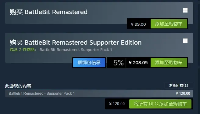2、打开登录steam客户端后,搜索BattleBit Remastered进入游戏页面,点击添加到购 物车,买好游戏后点击马上开始即可下载安装游戏;价格99,土耳其区的话是54。