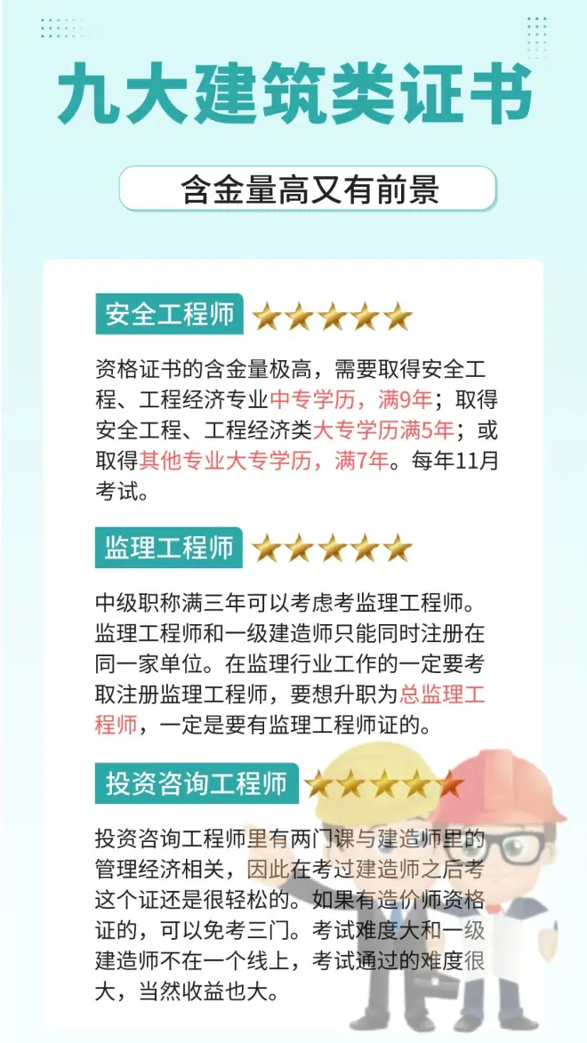 资格证书的含金量极高,需要取得安拳工程、工程经济专业中专学历,满9年;取得安拳工程、工程经济类大专学历满5年;或取得其他专业大专学历,满7年。每年11月考试。