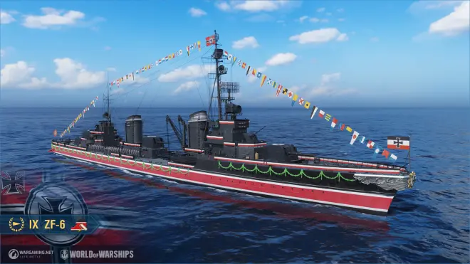 玩家将能够重返汉堡造船厂,建造全新德国IX级驱逐舰IX ZF-6号。这艘战舰拥有良好的隐蔽性;穿甲弹伤害高且具有改进的跳弹角度;可装备引擎增压、发烟器和防御型对空火力消耗品。对抗驱逐舰时,战舰可以用主炮组装填助推器消耗品来取得优势。而对抗重甲目标时,它的快速鱼雷会非常好用,不仅伤害极高且装填较快,但同时被发现的可能性也较高。