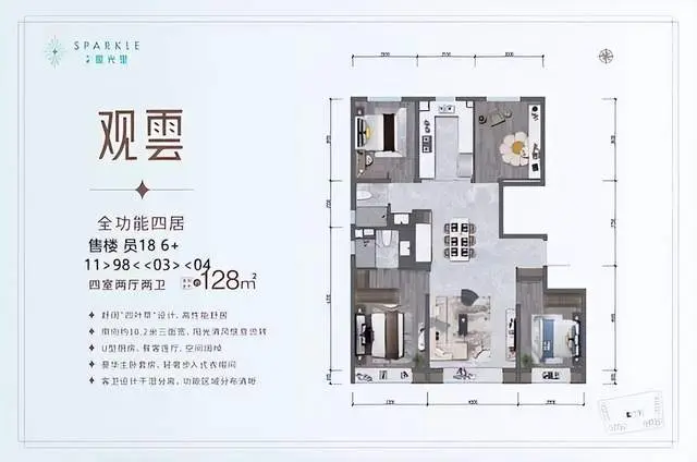 128㎡四居,家庭直接一步到位,经典的四叶草设计,四个卧室分布于四个角,互不打扰,客厅约4米面宽,LDK一体化设计,空间感非常强,主卧套房设计,双卫全明,最小的卧室面宽也有2.85米。