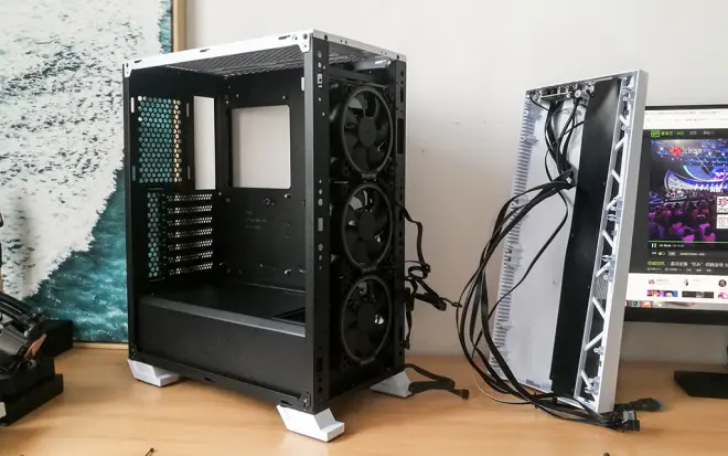 前面板是一个错位的设计,凸起的白色部位为前置风扇留出空气流动的空间,黑色的是金属栅格,保证风扇气流的进出。
