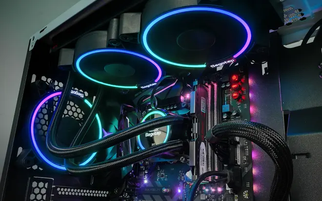 水冷头正中央是白色灯光的鑫谷logo,还有一圈RGB灯效跟散热风扇保持同步,同是环形的灯效动感十足。
