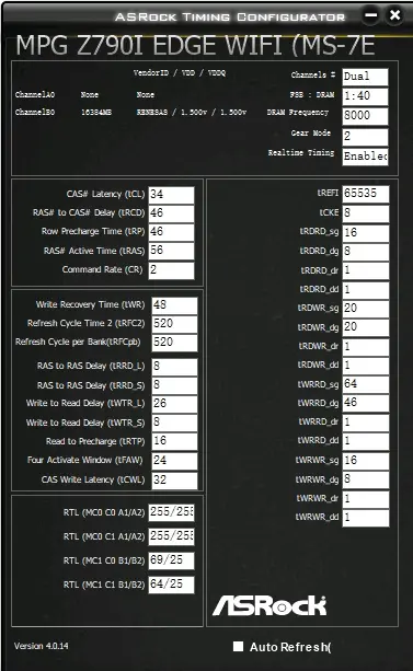 时序方面xmp7000hz c32-42-42-112 1.45v。默认频率4800hz 老方法进行超频测试,z790小刀锋仅插2槽,8000c34-46-56-520-65535带小参,cpu相关电压固定,只改变内存电压,时序如下图