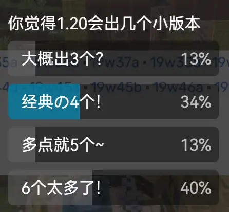 笨石的上个视频收集的关于1.20小版本的投票结果,现在看来要更新那么多小版本还任重道远(~ ̄(OO) ̄)ブ