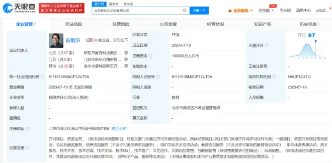 7月19日,北京新东方文旅有限公司成立,法定代表人为俞敏洪,注册资本达10亿元