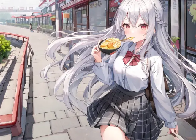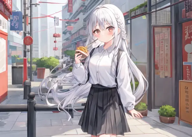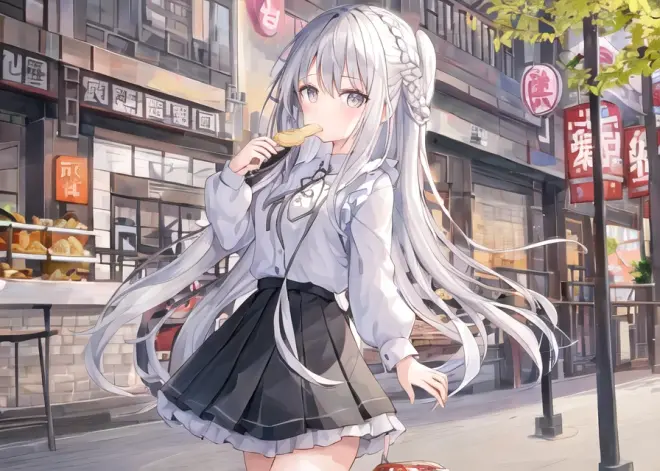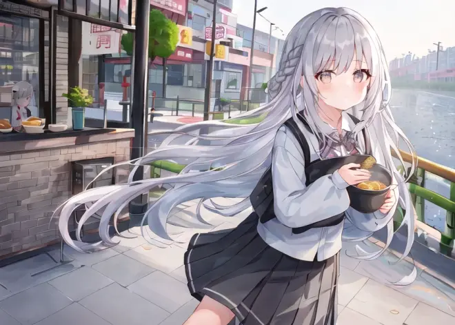 sai -r 768x512 -c 7 -t 28 1girl, close to viewer,cute,gray long hair, gray braided hair, white JK, black pleated skirt, ((((Eating while walking with a bowl of Regan Noodles)))) , morning, ((((Wuhan)))), Jianghan Road Pedestrian Street, breakfast shop, Wuhan hot-dry noodles with sesame paste,Egg wine, paste soup powder,Seafood tofu,Fried buns, tofu curd , roasted wheat
