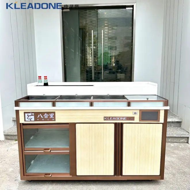 规格尺寸:1520*680*1040mm彩钢颜色:玫瑰金+木纹整体的外观贴合门店的装修风格,水果台开了一个不制冷的酱料槽,方便放一些酱油、蚝油等常温储存的酱料。品牌LOGO从水晶滴塑改为了发光字,这样能传播品牌形象,增加顾客对品牌的感知度。