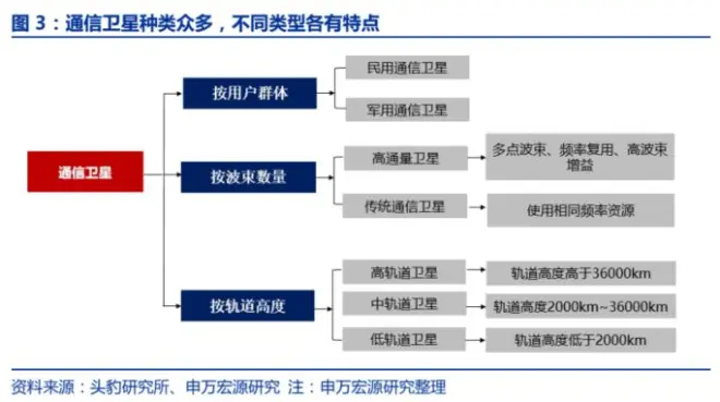 通信卫星有多种分类方式,可以按用户群体、波束数量及轨道高度进行分类。通信卫星按照用户群体可分为民用通信卫星和军用通信卫星,民用涉及卫星通信广播、数据传输服务等;军用通信卫星通过建立专网无线电通信设备,应用于战场信息传递,为指挥机关的实时决策提供依据。按波束数量可分为高通量卫星及传统通信卫星,高通量通信卫星是相对于使用相同频率资源的传统通信卫星而言的,主要技术特征包括多点波束、频率复用、高波束增益等。按照轨道高度不同分为低轨道卫星、中轨道卫星和高轨道卫星。