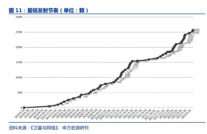 “星链”(Starlink)系统为目前全球规划规模最大、发射数量最多的低轨星座。“星链”是由美国 SpaceX 公司于 2014 年提出的低轨互联网星座计划,旨在建立一个覆盖广、容量大、时延低的天基通信系统,面向全球范围提供高速互联接入服务。根据 Starlink 官网披露,“星链”系统共规划 3 期,总规模接近 4.2 万颗卫星,由 3 层卫星网络组成,包括距离地面 340km 和 550km 的极低地球轨道卫星 9102 颗,以及 1150km 的低轨卫星 2825颗。“星链”(Starlink)系统于 2019 年 5 月首次发射,截至 2023 年 2 月 22 日,4 年间,已发射 3878 颗,在轨 3201 颗。根据 Starlink 官网披露,在 2021 年 1 月到 2021 年 5 月,以及 2022 年 2 月到 2022 年 5 月期间明显加快了布局速度,尤其是 2022 年 2 月 3 日至 5月 18 日,105 天累计完成 12 批次、611 颗卫星的发射(其中 573 颗运行)。就期而言,大约 8.75 天就批量发射 1 次,就频率而言,每天平均发射 5.81 颗卫星。