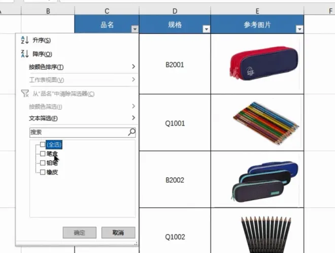 现在,我们要进行筛选,要找出品名为笔盒的所有数据。