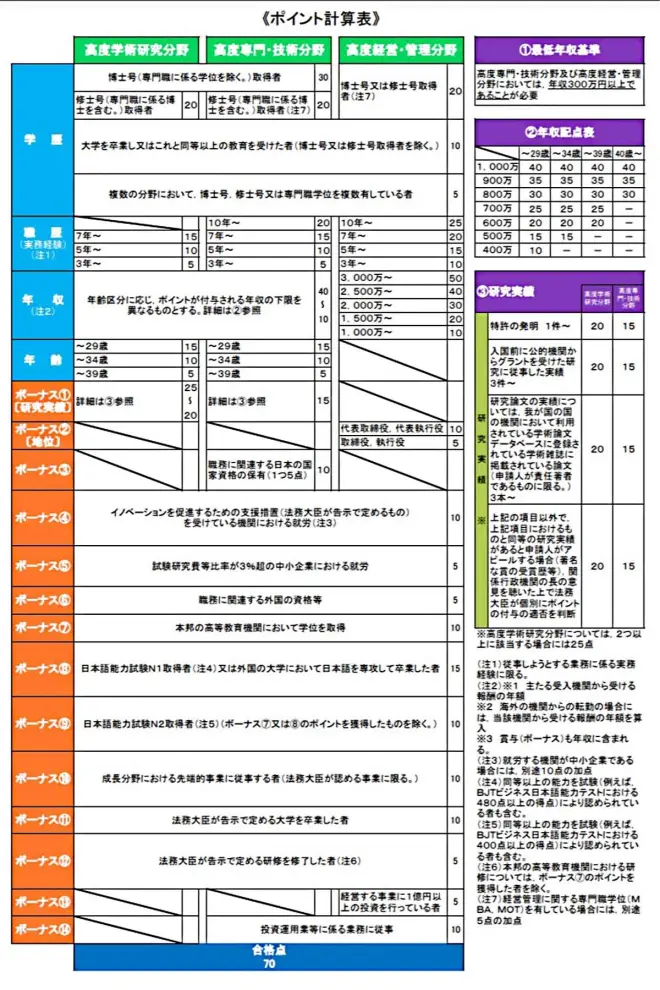 下面这张表是高度人才计算表,我们可以看到合格分是70分,也就是说你拿到70分,3年就可以拿到日本永住,但是如果你能再多拿10分,那么一年时间就可以办到,有人会想那及格岂不是会很难?