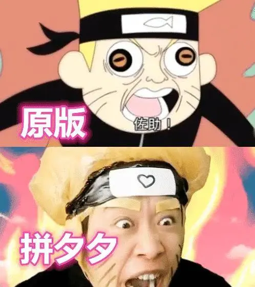 而图中的就是鸣人啦,先来看看原版的,上面的就是一个Q萌版的,而且正在生气的样子呢,眼睛也是蹬的大大的,而看到拼夕夕版的时候真的是笑了,这猛的一看还是不错的,但是这细节很差,这眉毛好像还是用胶带做的吧,瞪着眼的样子很好笑!