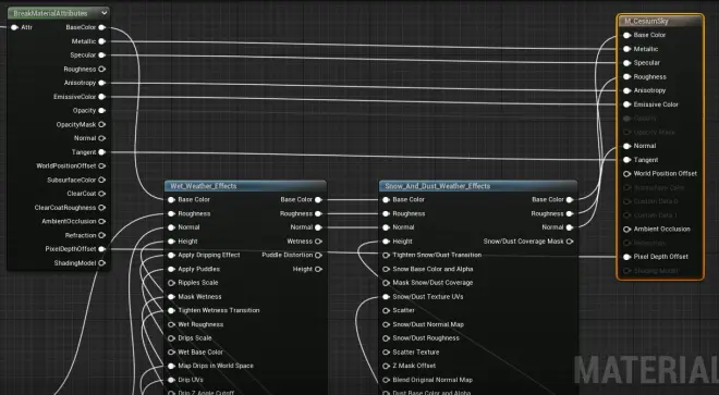 要实现上述内容就要进行材质的融合,首先找到UItraDynamicSky案例场景中模型的一个材质球,如下: