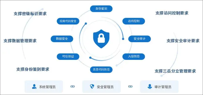 满足分级保护、等级保护管理等标准,从密级密标、数据管理、访问控制、身份鉴别、安全审计、三员分立等多个维度保障系统的安全性。