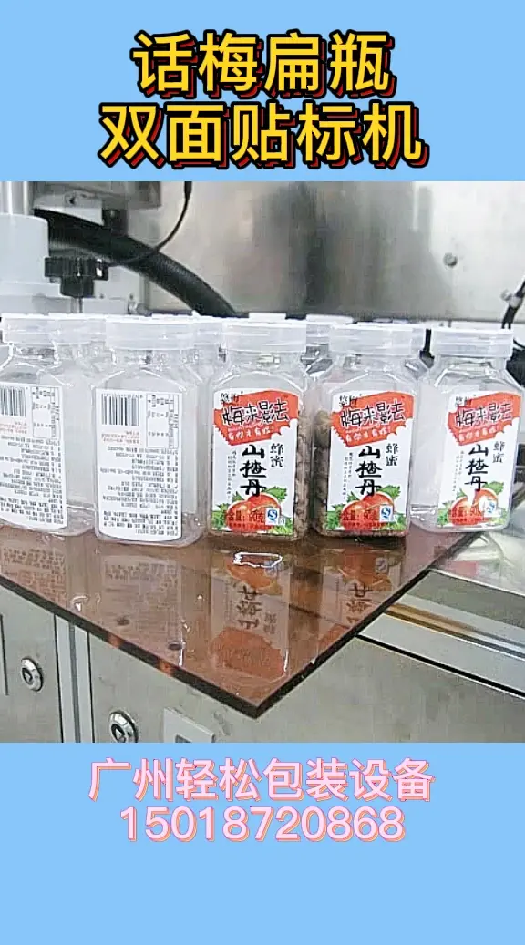话梅扁瓶双面贴标机-广州轻松包装设备。适用于圆瓶、方瓶、椭圆瓶、锥度瓶等物体的单侧或双侧面自动贴标。 加装相应机构可实现圆瓶圆周贴、前后对称贴标、方瓶一标贴三面或四面等功能。#贴标机厂家 #双面贴标机 #扁瓶包装 #不干胶贴标机 #设备厂家
