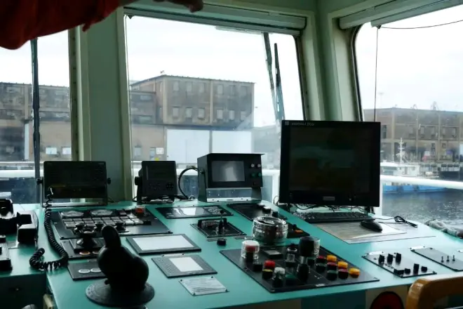 港区概览 看到眼前的港区内繁忙的景象,实践队员们对于铁路运输在港口等情境中与别的交通方式的结合有了更加形象的认识。 之后,实践团成员们前往一辆停泊于港口的拖船——东风4号进行参观学习。顾名思义,拖船是一种接驳船,它的作用在于帮助大型货船进行靠岸工作以便之后的卸货。初入拖船,实践团成员们便被船内的景象所震撼,与想象中的不同,船内的设施一应俱全,无论是供船员们休息的卧室还是日常生活中会用到的厨房、卫生间、休息室等均与陆地上的房子别无二致。东风四号的大副告诉我们,随着新时代祖国经济的快速发展,船员的生活条件也是得到了大幅改善。随后实践团的小伙伴们跟随着大副来到了甲板上的主控室,在这里大副向小伙伴们详细介绍了拖船的工作原理及运作方法,并展现了平日里船员们的工作状态。