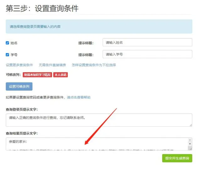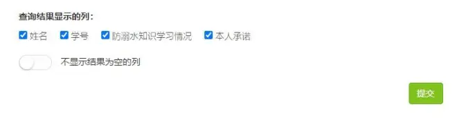 4、设置查询结果显示的列:根据需求,可以设置显示在查询结果页里面的列;以本次暑假防溺水安全承诺书为例,需要家长填写信息提交,则查询结果列全部勾选。