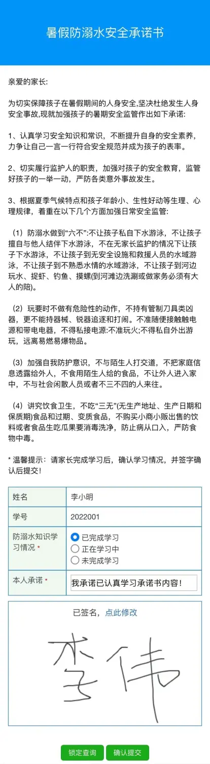每年暑假是溺水事故频发的高峰期,溺水是造成中小学生意外死亡的第一杀手;为确保学生们都能安全健康地欢度假期,在暑假到来之前,很多学校都会要求学生及家长认真学习假期防溺水的相关知识,并签署假期防溺水的安全承诺书。传统的签署承诺书的方式是:学校印刷承诺书→班主任下发纸质承诺书→家长或学生签字→班主任收集上交。整个过程不仅繁琐而且效率较低,还浪费纸张。