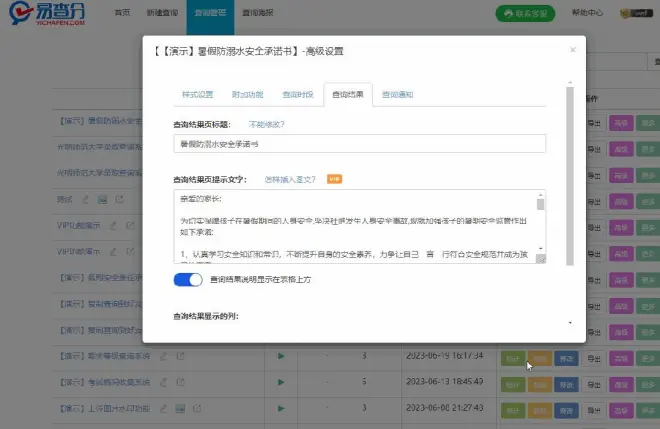 2、设置查询结果页标题:可以根据自己的需求自定义设置(如:暑假防溺水安全承诺书);如果不修改,默认会显示“查询结果”4个字,导出的PDF则会显示查询名称(注:修改查询结果页标题功能仅支持金牌及以上会员使用,联系微信客服可以免费升级金牌会员);