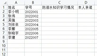 1、准备电子表格:根据需求,提前制作好电子表格(内容包括学生姓名、学号等需要验证的信息,需要家长确认的信息、承诺内容所对应的列,可以空着不填,后续可以在可修改列中进行设置,表格里只需要包含表头即可);