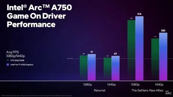 如果考虑到锐炫A750和RTX 3060显卡的价格,锐炫A750相对RTX 3060而言,在《死亡回归》的性能表现上,每美元提高62%与65%;《工人物语:新兴同盟》每美元提高63%与75%。