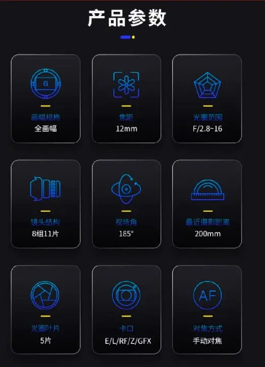 首先这是一个全画幅镜头,焦距是12mm的一款鱼眼镜头,如果矫正之后大概可以得到全画幅14-15mm左右广角视角,光圈范围是F2.8,F4,F5.6,F8,F11,F16,每档光圈之间都有一个小梯度作为有级调节,晚上使用也会比较方便。