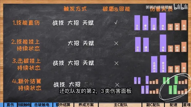 - 技能直伤可通过:战技、大招、天赋触发,且都能做到破盾和回能。