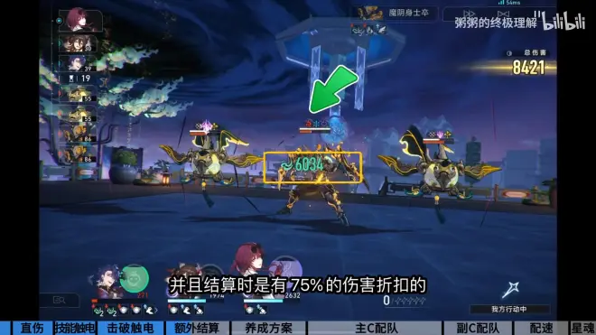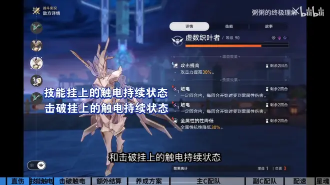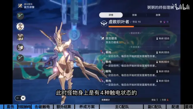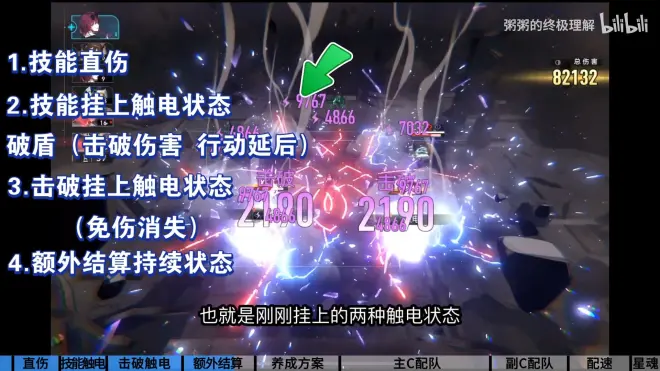 - 以大招为例,先是造成技能直伤,技能挂上触电状态,同时技能又破盾(造成击破伤害,使敌方行动延后),击破挂上触电状态(免伤消失后),额外结算持续状态(挂上两种触电状态时已经可以额外结算一次)。