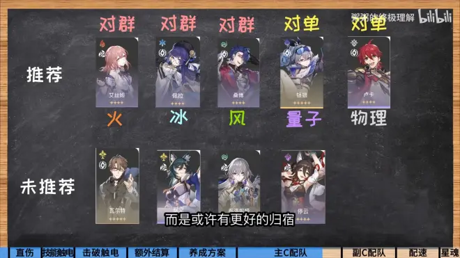 - 可根据敌人弱点选择(火系艾丝妲、冰系佩拉、风系桑博、量子银狼、物理系卢卡),或者根据敌人数量选择(对群艾丝妲、佩拉、桑博,对单银狼、卢卡)。