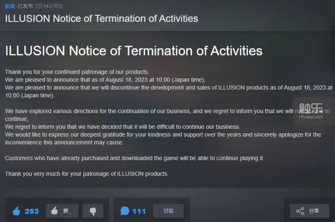7月14日,业界知名“特殊题材”厂商Illusion,突然宣布将在8月18日终止游戏开发和销售活动。消息一出,不少人感慨:“我的青春又一次结束了。”