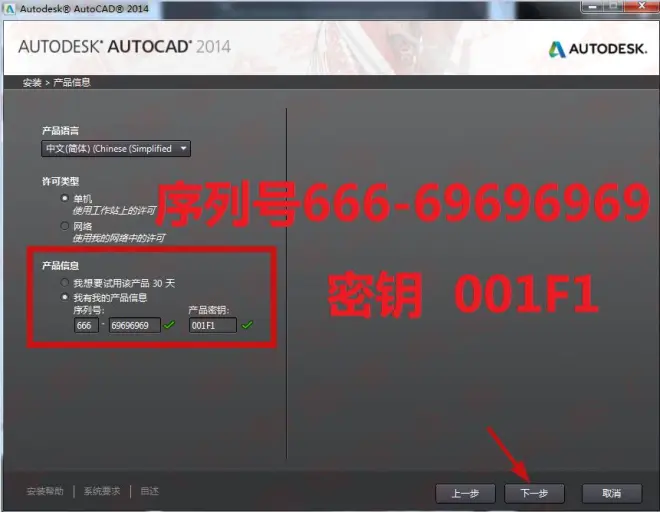 5.输入序列号“666-69696969”,密钥“001F1”,点击“下一步”。