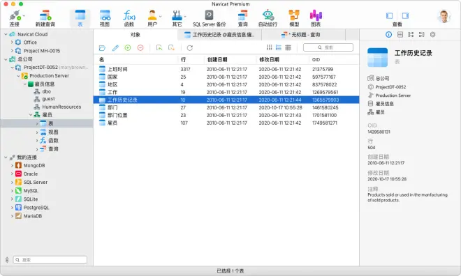 2.在Navicat的主界面中,可以查看已连接的服务器的数据库,可以执行SQL语句,可以查看表和表中的数据等。