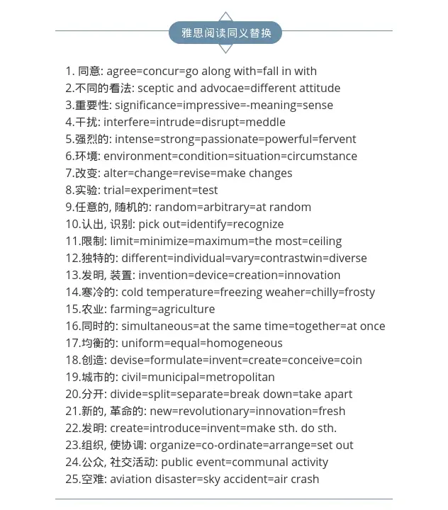 在雅思考试中,同义替换对雅思的考试是十分重要的!很多考生会因为不认识同义替换的词从而导致阅读速度以及理解程度受到影响。据统计,在雅思阅读中有70%-80%的错题都是因为没有识破文章和题目所对应的同义替换,所以想要提升阅读的正确率,掌握雅思同意替换词是至关重要的。
