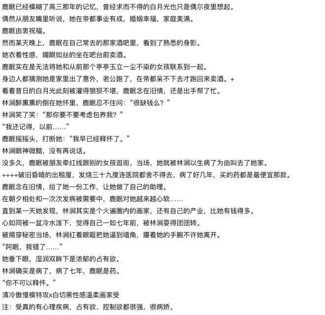 推gl文[疯批➕钓系+病娇]文名:白月光她追悔莫及 评价:林涧的疯批与钓系特性使得她对鹿眠做出的事情让人直呼上头又刺激,通过自己的手段与力量慢慢渗透到鹿眠的一切,先是鹿眠的生活,再是鹿眠的工作。林涧对鹿眠的控制欲爆表,深受影响的鹿眠对林涧亦如此。该如何来形容林涧的受呢?我觉得0来形容林涧都显得有些攻,负数最合适。