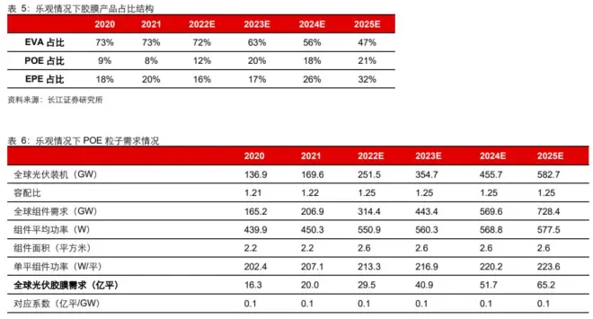 乐观情况下预计 2023 年 EVA 胶膜、POE 胶膜、EPE 胶膜占比分别可达 63%、20%、17%。