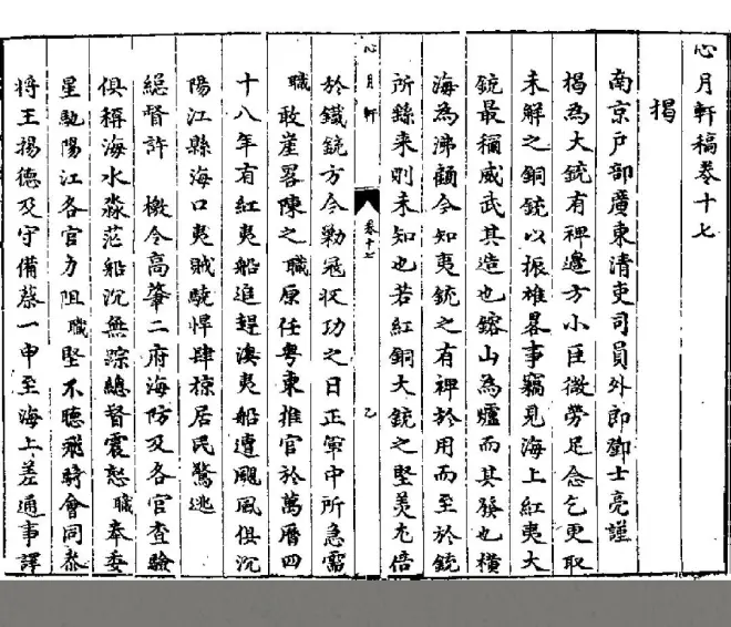 天启七年九月原两广总督商周柞北解红夷铜炮两门,铁炮八门。 《崇祯长编》卷之二