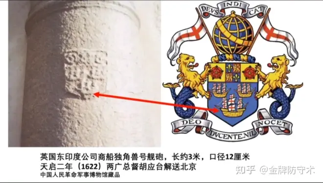 在招募葡兵的同时,天启二年,两广总督胡应台也应兵部的要求,在广东打捞的英国铁炮中,挑选出二十四门押解入京。可能路上有折损,也有可能记载纰漏,实到者只有二十二门。 目前还留有两门当年的实物。炮身铸有盾形徽章和后加的刻款:“天启二年总督两广军门胡 题解红夷铁铳二十二门第六门”,“第十四门”。徽章是英国东印度公司的炮徽。 火炮全长300厘米,口径12厘米,就倍径来看,属于21倍径的加农炮,就口径来看,应该是使用12磅铁弹。