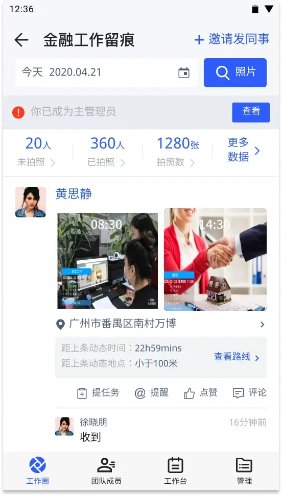 将同事拉近工作圈后,他们只需要使用马克水印相机拍照,照片就会自动实时同步到工作圈,并且这些照片会自动分析成各种数据,如员工拍照数据、考勤打卡数据、排班数据等等,而且上传的照片都可以查看和下载,都是存储到团队的相册内的,为日后工作的留存留证,追溯工作的源头留下影像。并且管理员可以看到团队内的工作情况、照片,方便进行工作的交流。