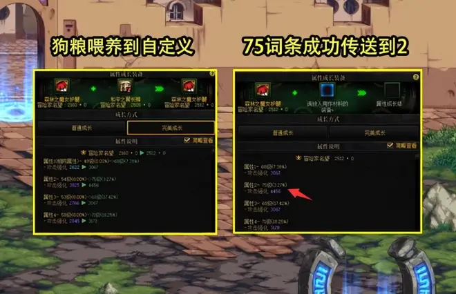 在交换词条之后,完美喂养千万不要喂养反了,如果是自定义喂养狗粮将完全没有作用,如果要达到我们的目的,需要把狗粮喂自定义装备,狗粮4词条由于和自定义胚子1词条相同,剩余词条按照顺位,就能把75词条挤到2词条上,然后狗粮喂养到身上的装备,我们的目的也就达成了。