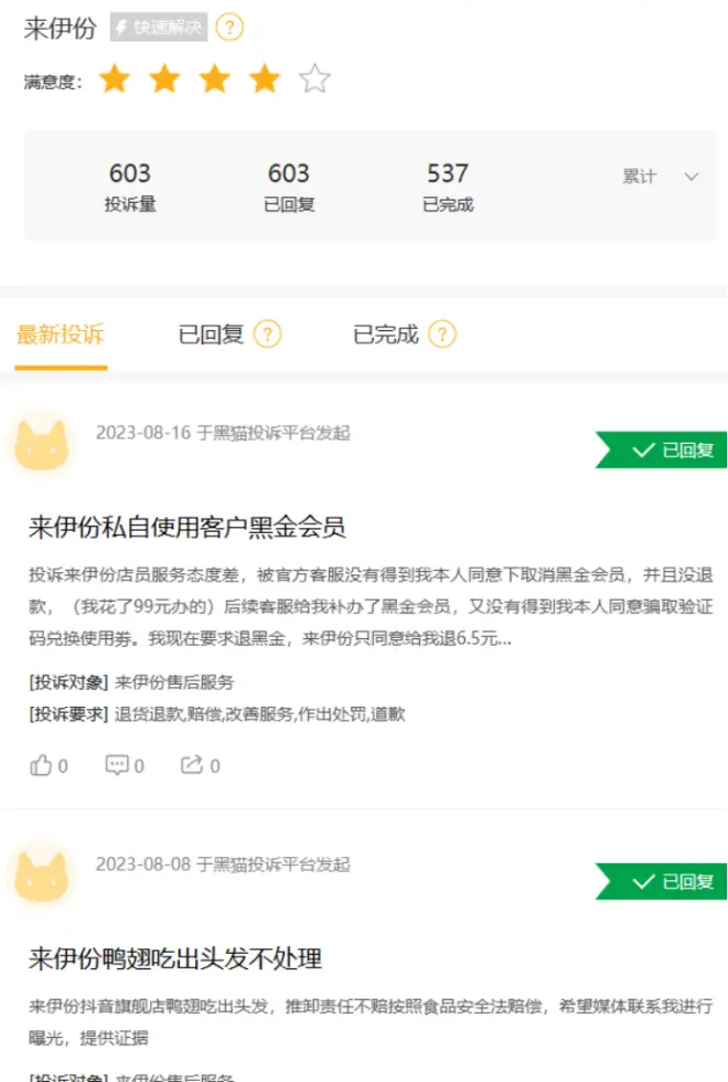 8月16日,《港湾商业观察》于黑猫投诉平台搜索关键词“来伊份”共发现603条投诉量,其中有消费者投诉“吃出头发、手撕素肉发臭变质、鸡腿骨头发黑”等食品安全问题。
