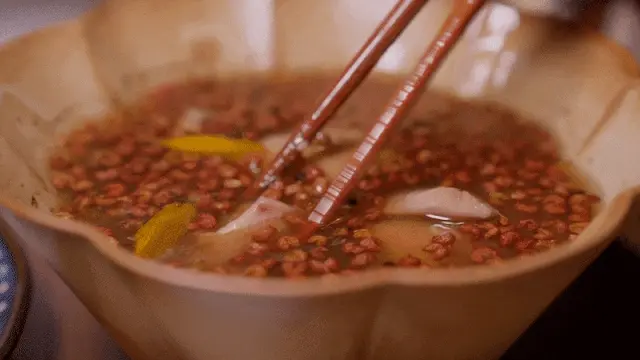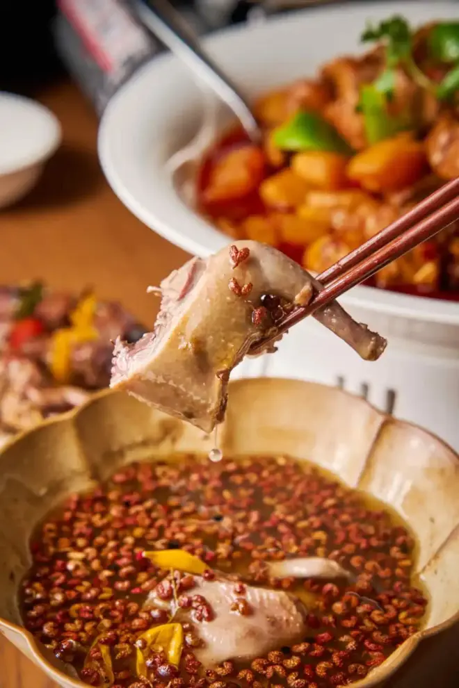 整只乳鸽浸润在红润饱满的花椒颗粒下,轻淋热油,更深层次地激发起鲜味。鸽子肉外皮弹韧,内里鲜嫩油润,随着阵阵椒麻感轻触舌尖,似在心尖挠痒痒。