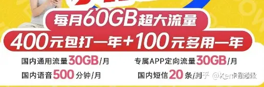 每月可享受30G通用+30G定向+500分钟+20条短信