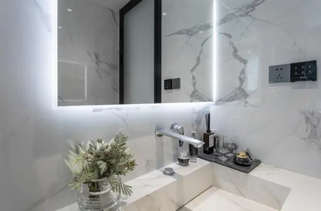 最后我们来到了卫浴间,墙面采用卡拉拉白搭配意大利狐地面。天然纹理如水墨画般气势恢宏地在墙面上肆意挥洒,成为卫浴室独特的风景,让你淋浴也能淋出高级style。
