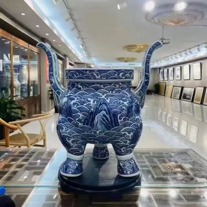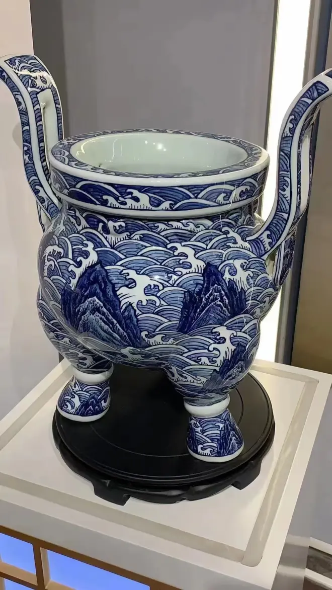 有安定繁荣之寓意的《中华盛鼎海水江崖纹三足炉》青花瓷